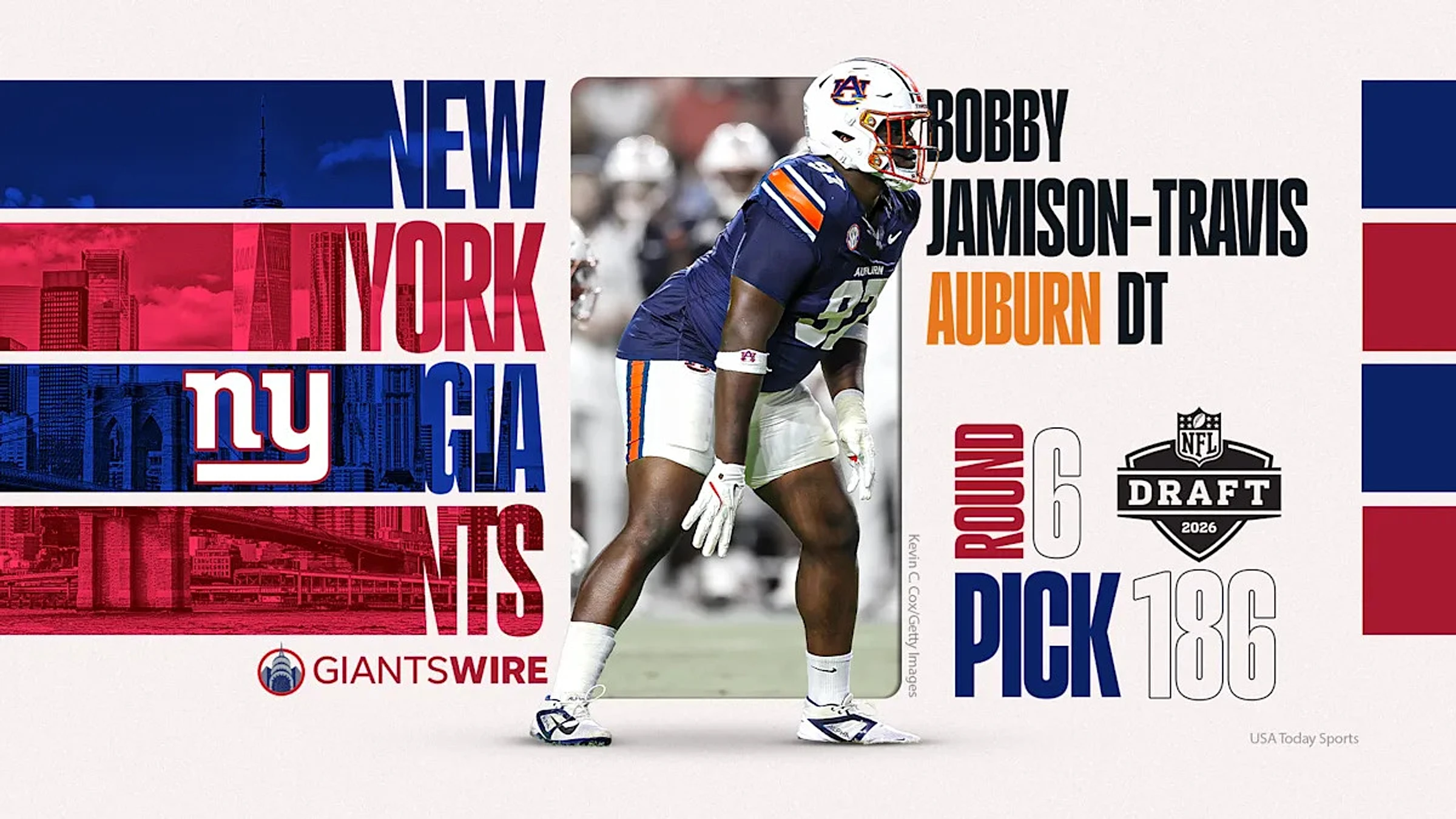 The New York Giants added depth to their defensive line on Day 3 of the 2026 NFL draft, selecting Auburn nose tackle Bobby Jamison-Travis with the 186th overall pick.