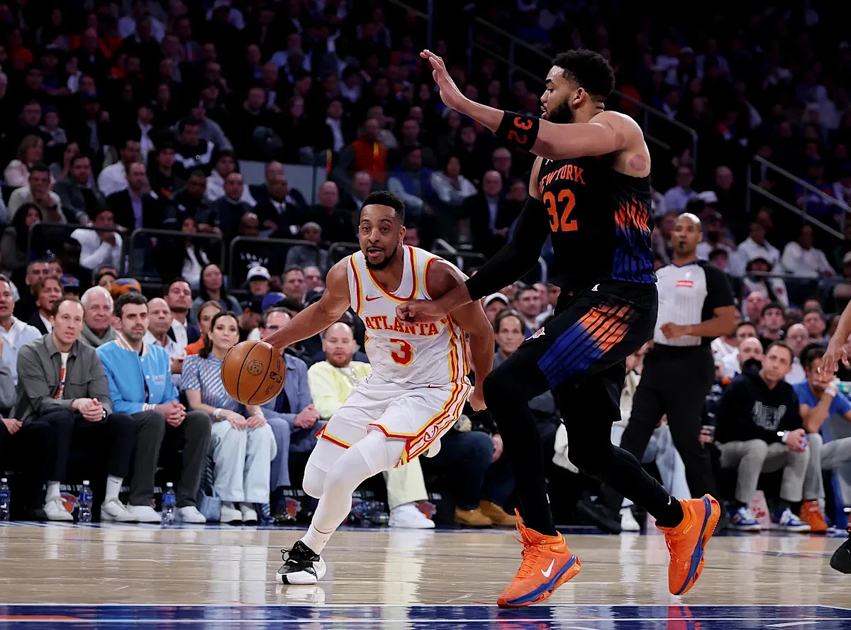 Toward the end of the first quarter, Mitchell Robinson was called for an offensive foul after he knocked Hawks defensive stopper Dyson Daniels to the floor as he set a screen for Brunson.