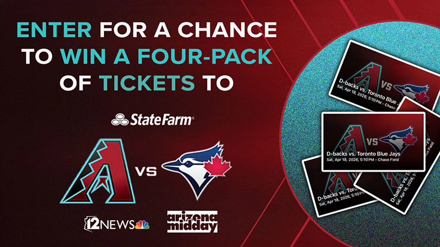 Calling all Diamondbacks fans! Want to catch the action live at Chase Field? We're giving you the chance to score a four-pack of tickets to see the Arizona Diamondbacks take on the Toronto Blue Jays on Saturday, April 18th.