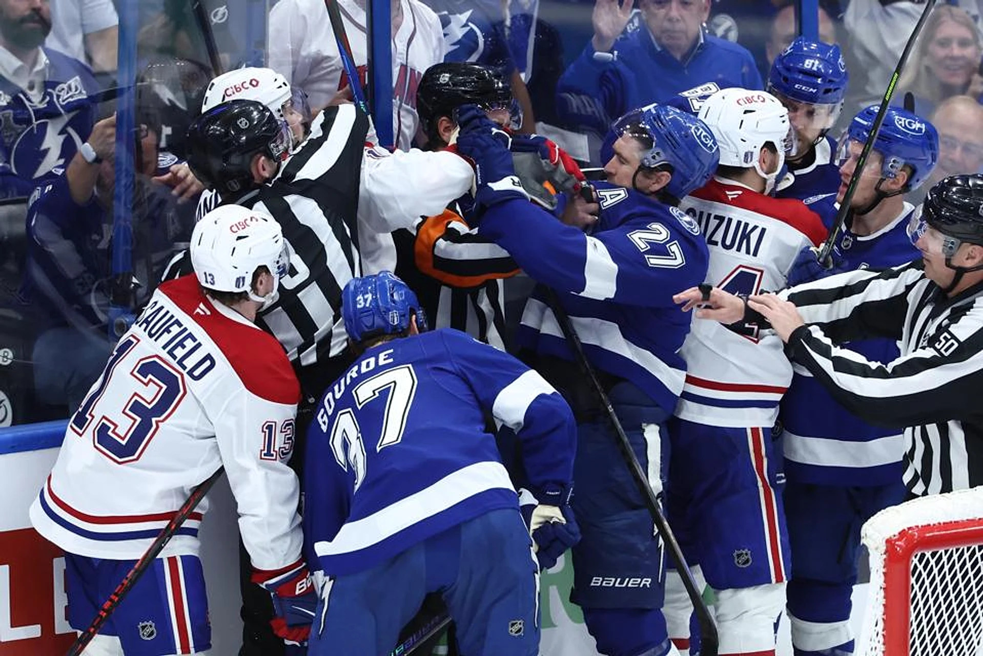 The drama only intensified in the third period. With the score tied at 2-2, Lightning defenseman Darren Raddysh unleashed a low shot from the slot that beat traffic and clanged off the post. The rebound bounced over the stick of Nikita Kucherov, who was staring at an open net as a desperate Alexander Carrier scrambled to recover. Less than a minute later, as Tampa Bay was caught in a line change, Lane Hutson threaded a perfect pass to Alexander Texier, who beat goaltender Andrei Vasilevskiy with a shot the Vezina Trophy winner would normally snag. It was Texier’s second goal of the series—more than stars Nick Suzuki and Cole Caufield have managed combined.