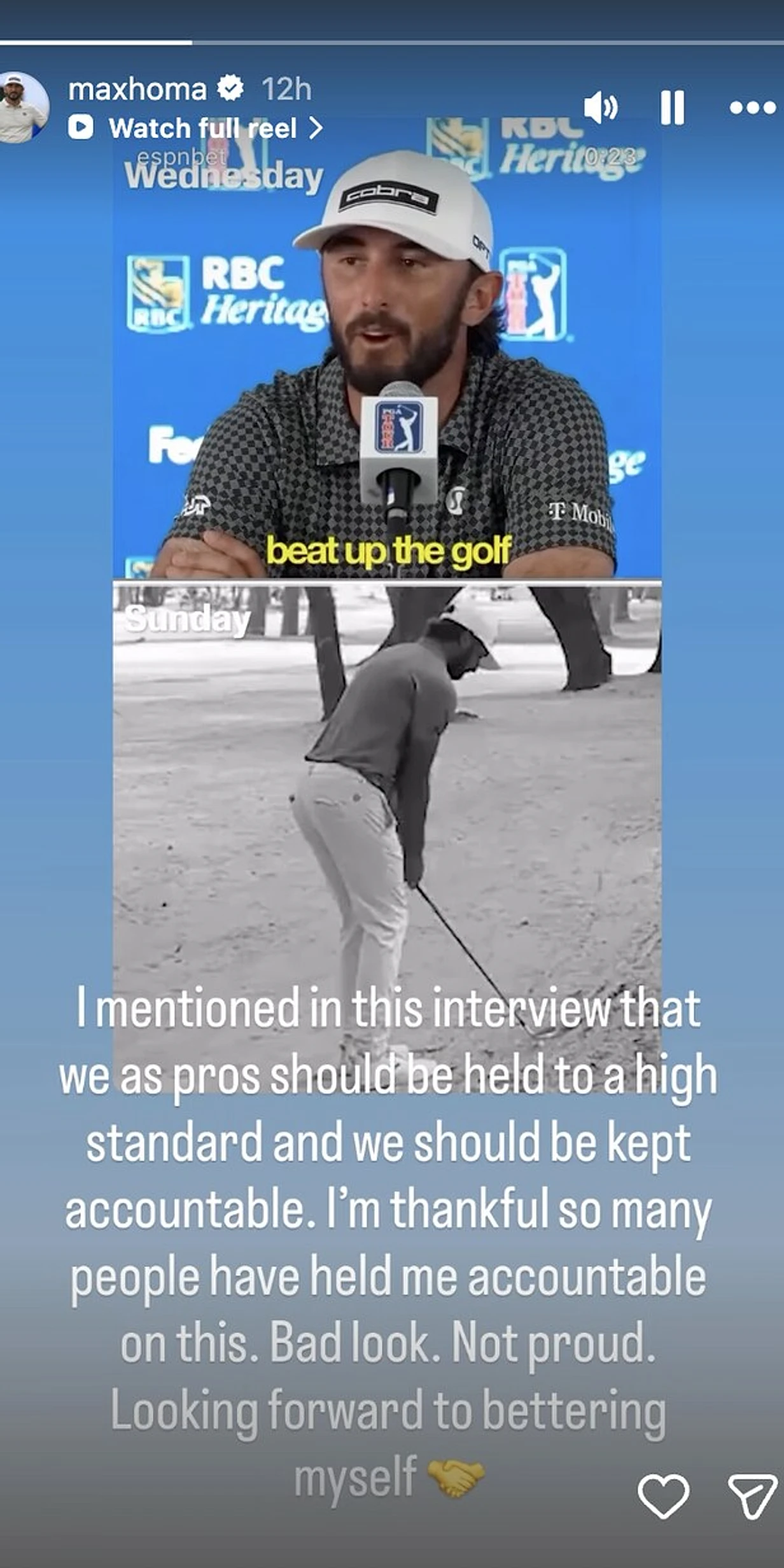 “I mentioned in this interview that we as pros should be held to a high standard and we should be kept accountable,” Homa wrote on his Instagram story accompanying a video of his press conference quotes and subsequent club throw. “I’m thankful so many people have held me accountable on this. Bad look. Not proud. Looking forward to bettering myself.”