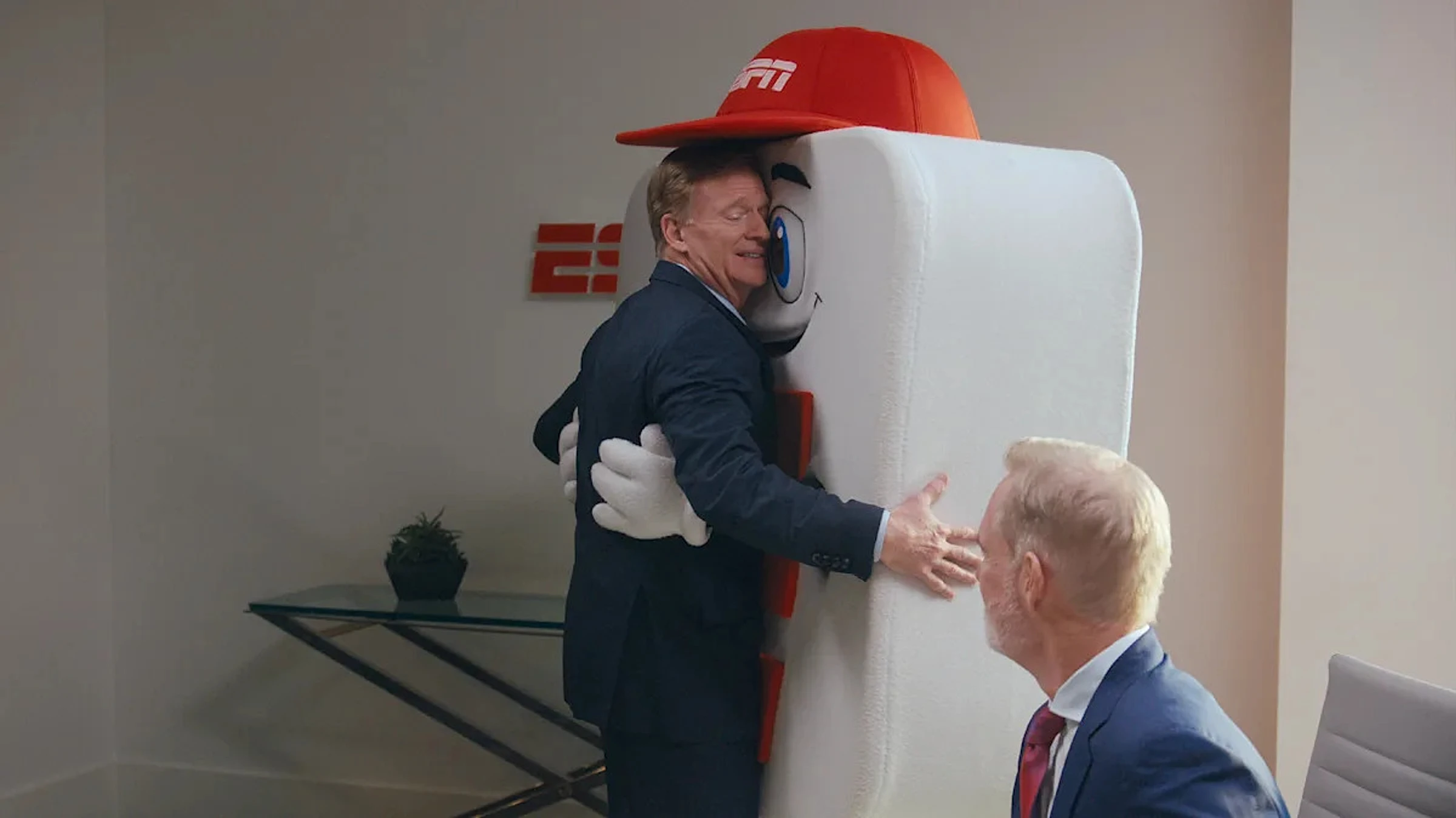 The NFL boss acts as if he’s calling out a finalized draft selection, and after awarding the 61st Super Bowl to ESPN, tells the assemblage: “You’re on the clock.” He then gives App-E an awkward hug and tells Buck, who has called six past Super Bowls, “Congratulations on your first Super Bowl.”