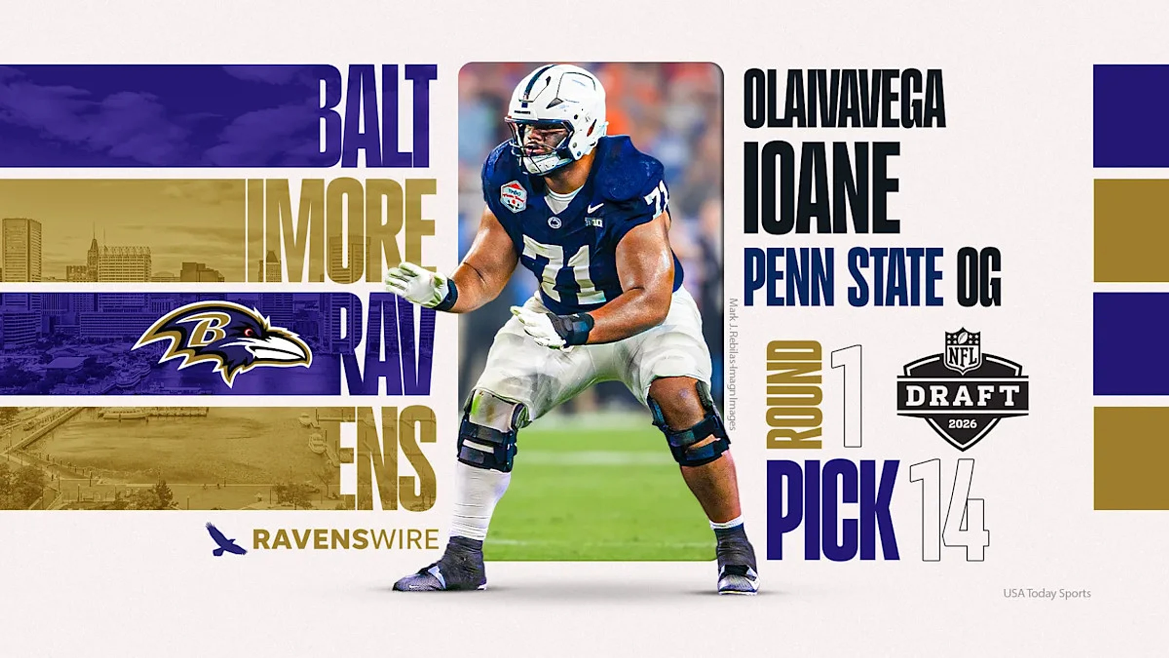 Penn State's top draft pick is officially off the board in the 2026 NFL draft. Offensive lineman Olaivavega Ioane was selected by the Baltimore Ravens with 14th pick of the first round of the 2026 NFL draft on Thursday night.