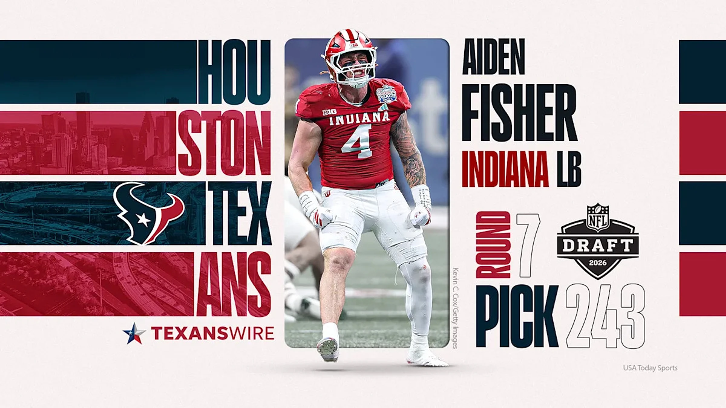 With pick No. 243, the Texans landed Indiana linebacker Adien Fisher to bolster the second level of the defense. He should be considered a fan favorite and a Day 3 gem should he transform into the next standout for DeMeco Ryans' defense.