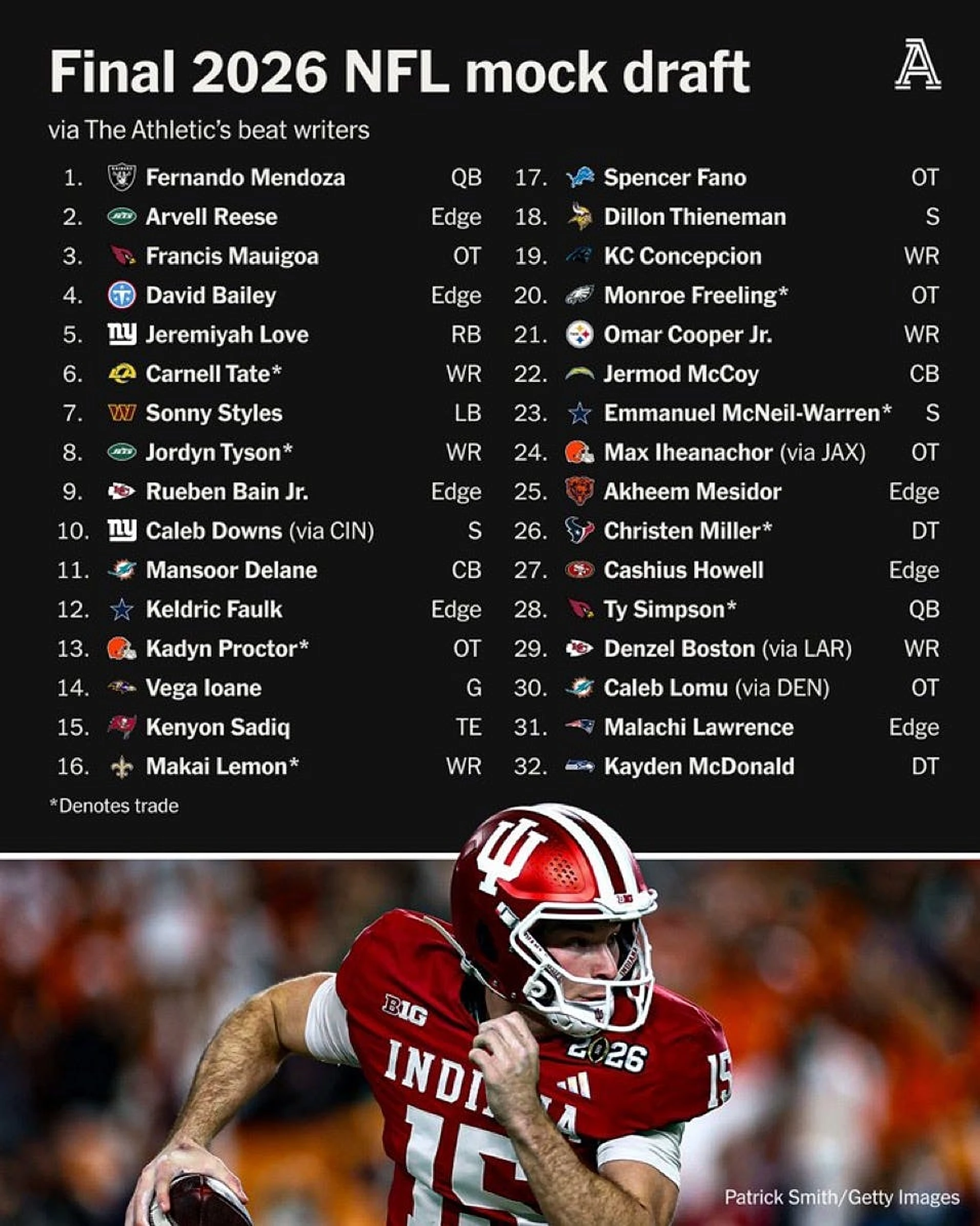 This time tomorrow, the first round of the 2026 NFL Draft will be underway. That means all the outlets are releasing their final mock drafts. USA Today Wire sites were among them. One of the more notable being The Athletic's network mock draft.