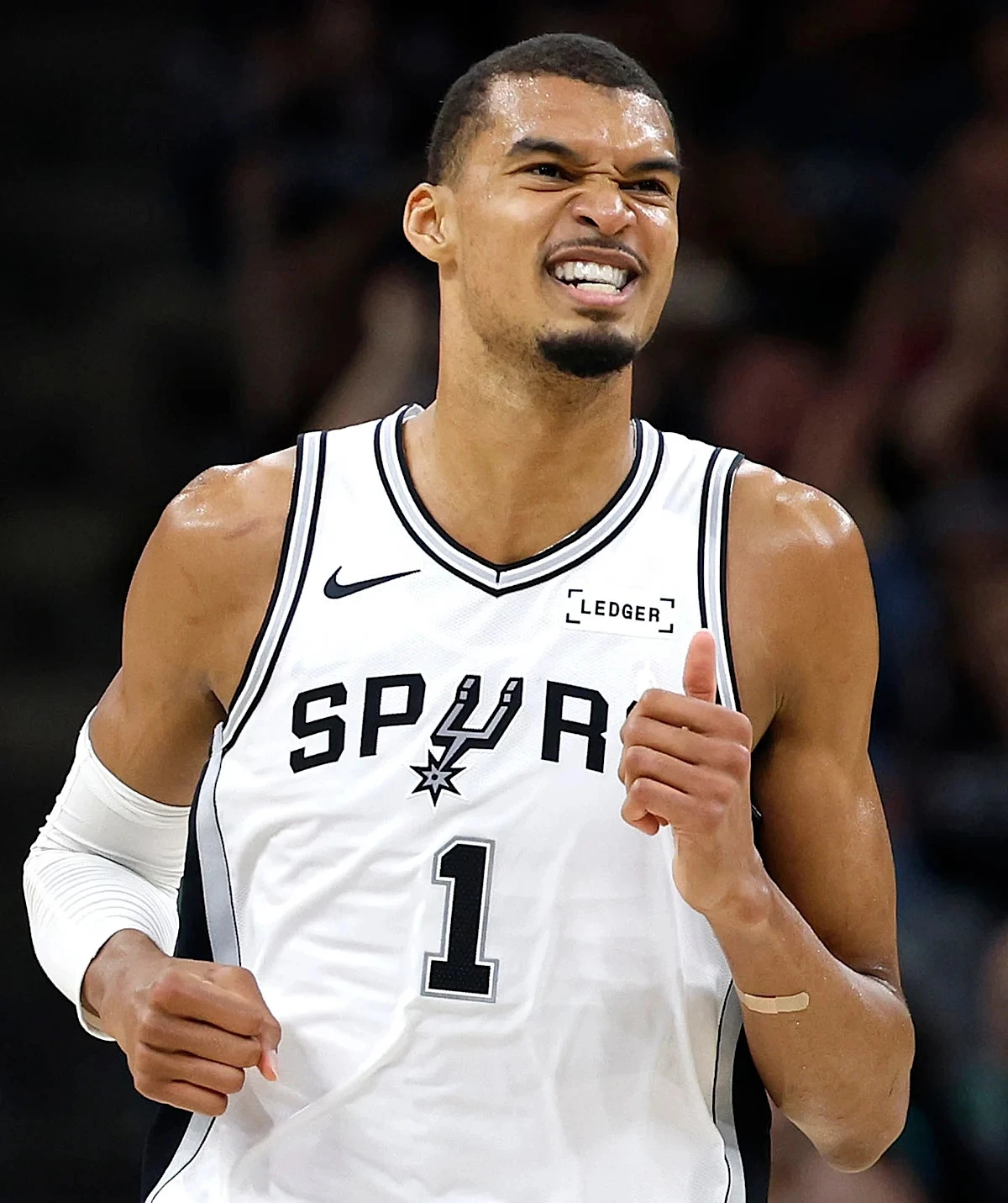 San Antonio Spurs forward forward Victor Wembanyama pumps his fist at the end of the second half against the Detroit Pistons at Frost Bank Center on Mar. 5, 2026. Victor Wembanyama became the youngest player in NBA history to win the league's Defensive Player of the Year award Monday, April 20 in the first unanimous vote in league history.