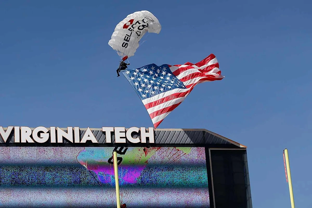 In a statement, Virginia Tech Athletics confirmed the skydiver was "safely secured and is currently stable," thanking first responders for their professional and coordinated efforts. Social media footage later showed part of the parachute still dangling from the board as crews worked to resolve the situation.