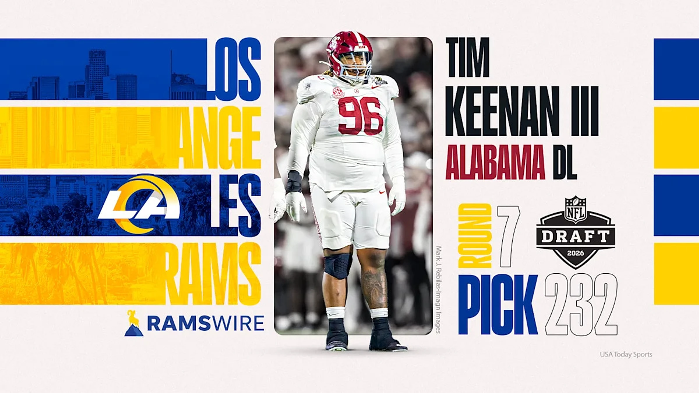 Alabama defensive lineman Tim Keenan lll was selected in the seventh round of the 2026 NFL draft, taken by the Los Angeles Rams.