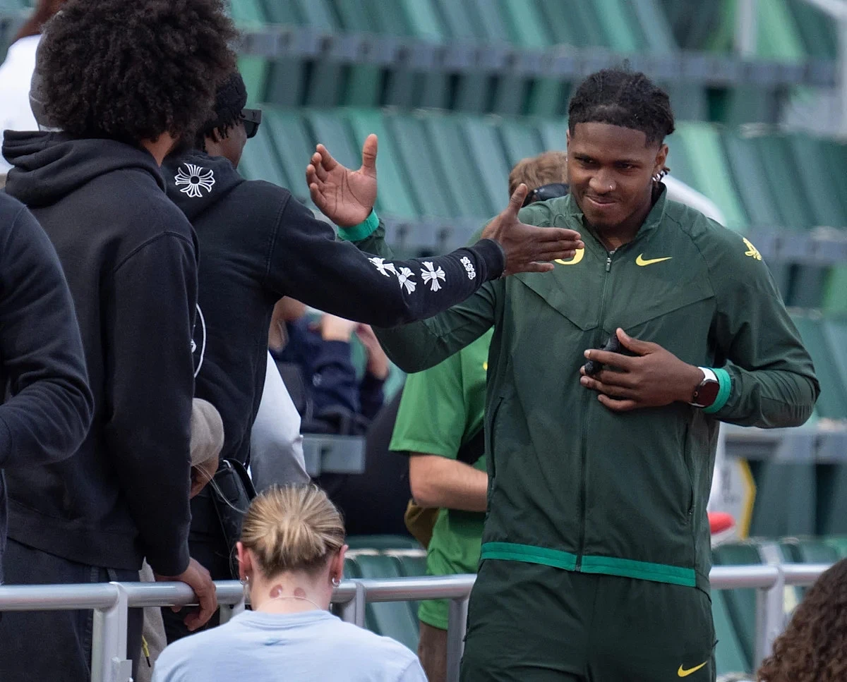 On Friday afternoon, Oregon star wide receiver Dakorien Moore lined up at Hayward Field, taking part in the long jump for the first time since his junior year in high school as part of the Oregon Team Invitational. He made it to the finals and finished sixth in the event — not bad for someone who hasn't competed in three years and has a different primary sport.