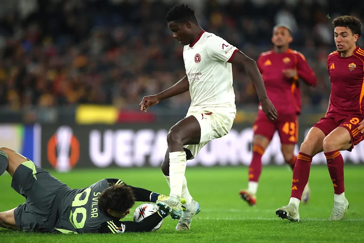 ROME, ITALY – NOVEMBER 27: Daniele Ghilardi of AS Roma competes for the ball with Dju Franculino of FC Midtjylland during the UEFA Europa League 2025/26 League Phase MD5 match between AS Roma and FC Midtjylland at Stadio Olimpico on November 27, 2025 in Rome, Italy. (Photo by Paolo Bruno/Getty Images)