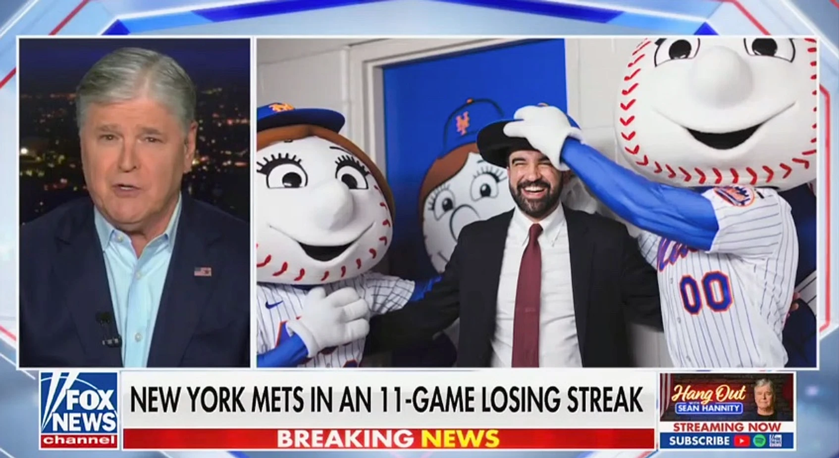 Sean Hannity suggested that the New York Mets’ 11-game losing streak has something to do with the team’s mascots hugging New York Mayor Zohran Mamdani.