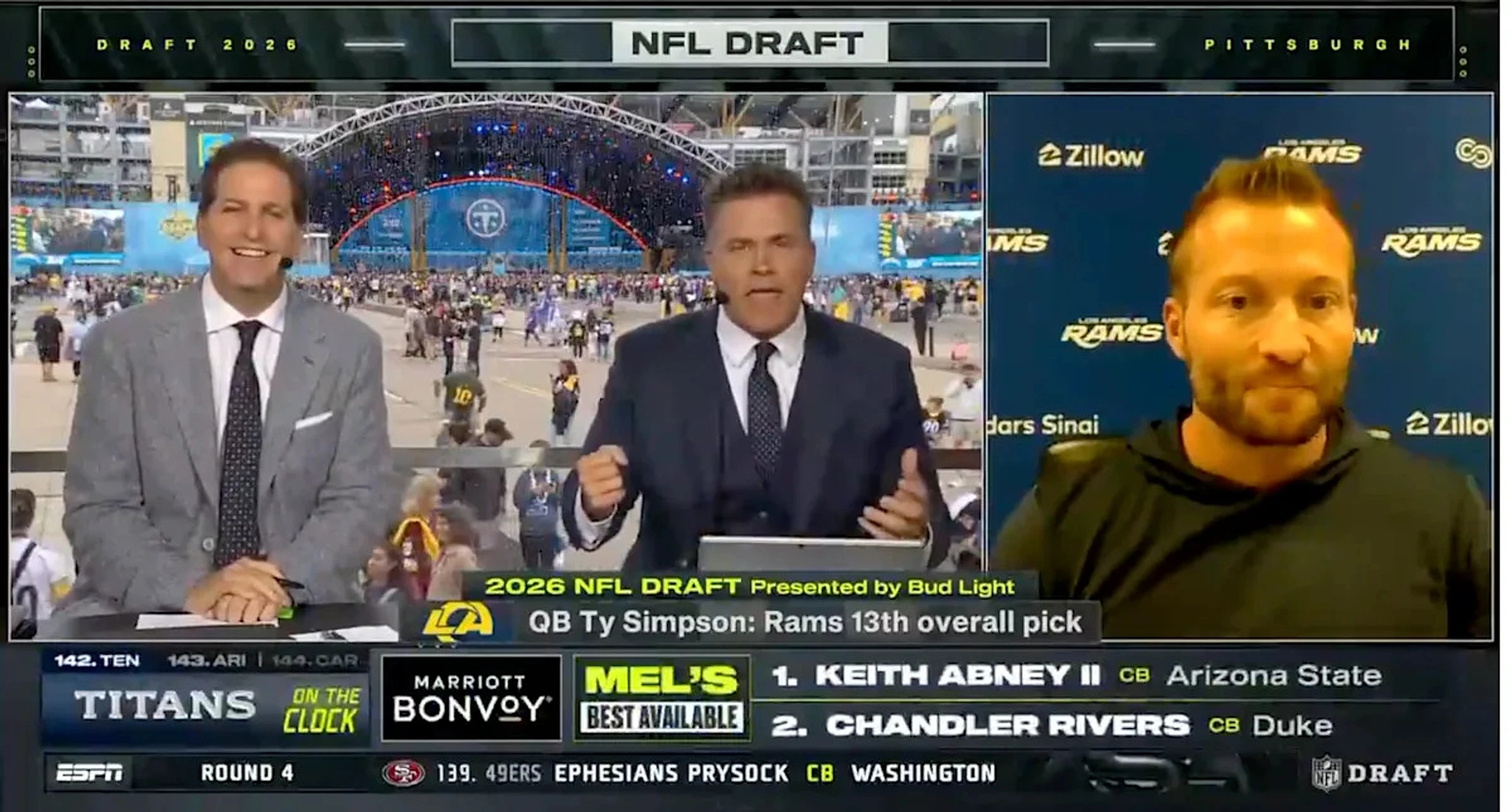 His hustle paid off. During the seventh round, Brandt joined Rece Davis, Mel Kiper Jr., Louis Riddick, and Field Yates at the main desk. While fans enjoyed his candid admission that he once tried to poach Yates for NFL Network over a secret lunch, the more significant moment came when Brandt and Schrager secured an interview with Los Angeles Rams head coach Sean McVay.