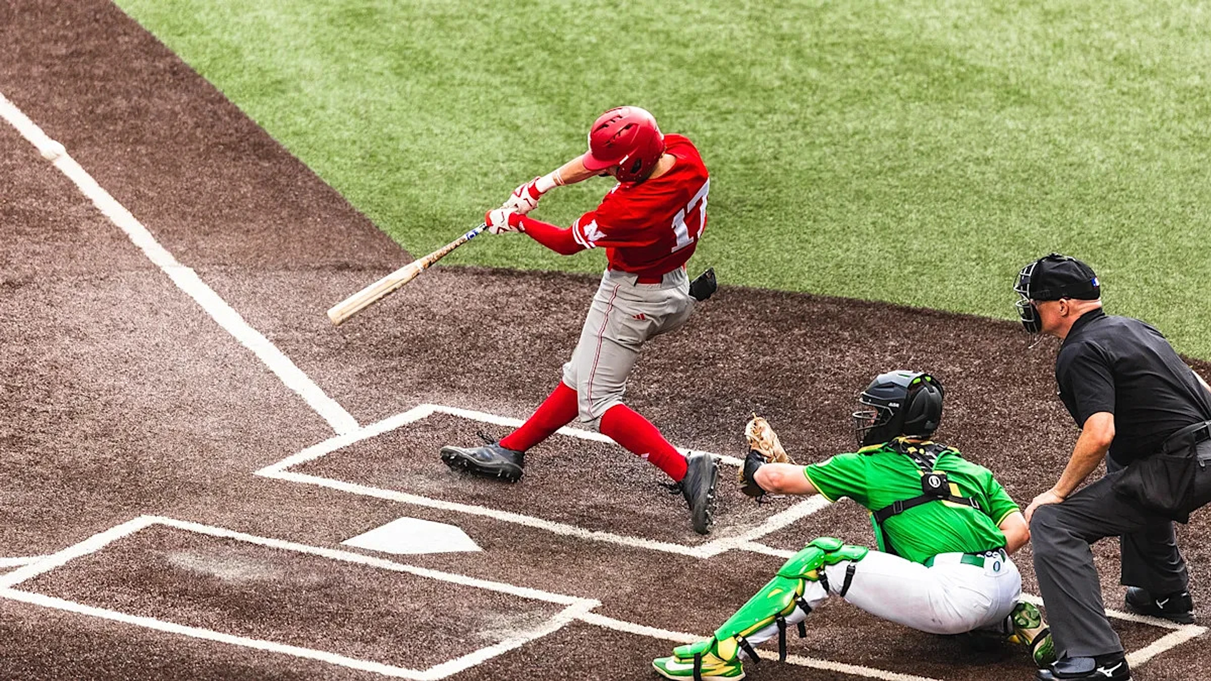 The game entered a 1 hour and 42 minute weather delay in the bottom of the 6th, ending the game for both pitchers. Braxton Stewart took the mound for Nebraska and he almost exclusively throws a slider, but it just wasn’t biting tonight. A double down the right field line was followed by back to back no doubter home runs on high hanging sliders. Both cleared the Husker bullpen on the other side of the left field wall. Just like that, the Ducks were up 7-2 and had all the momentum.