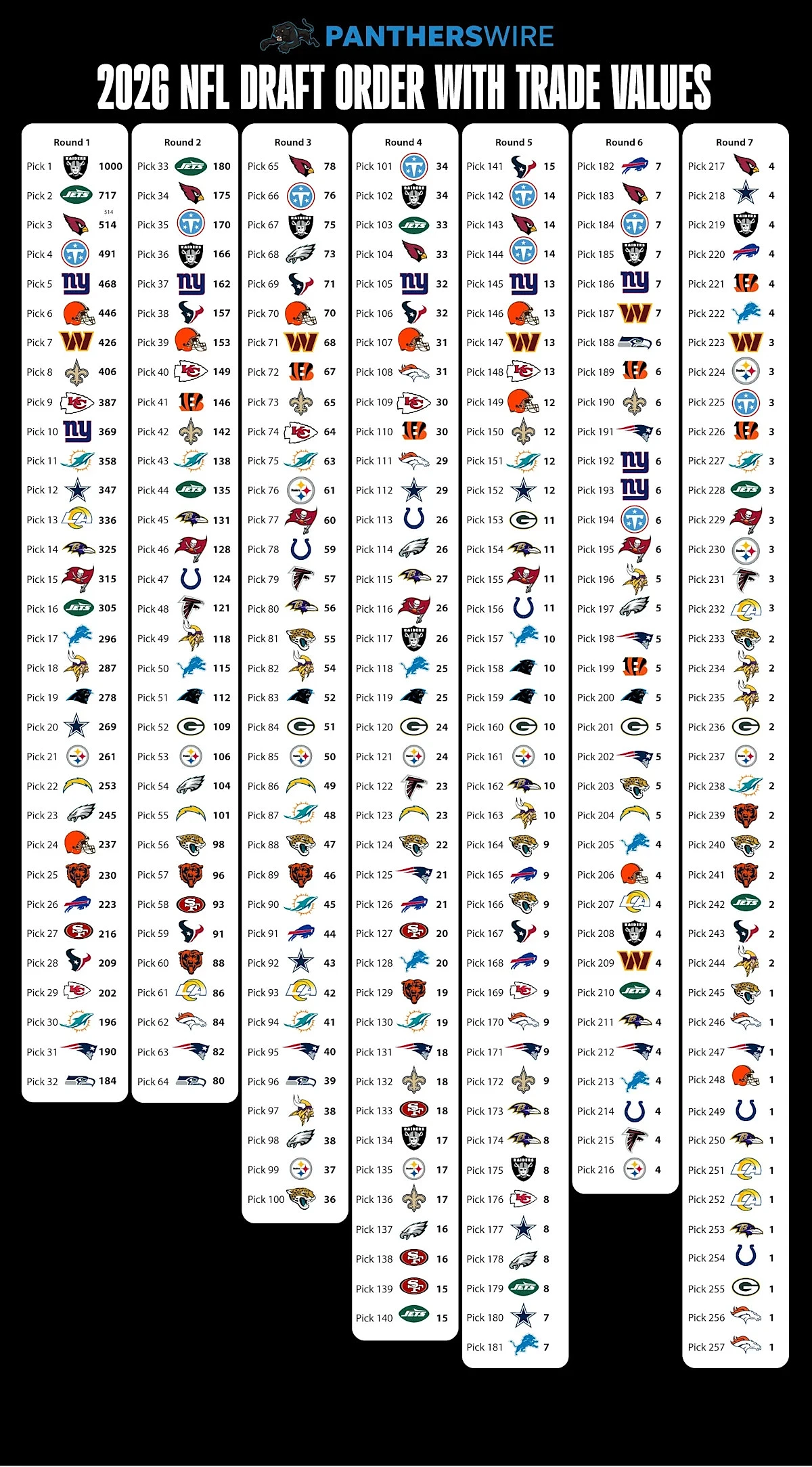 This article originally appeared on Panthers Wire: 2026 NFL Draft order with trade values for all 257 picks