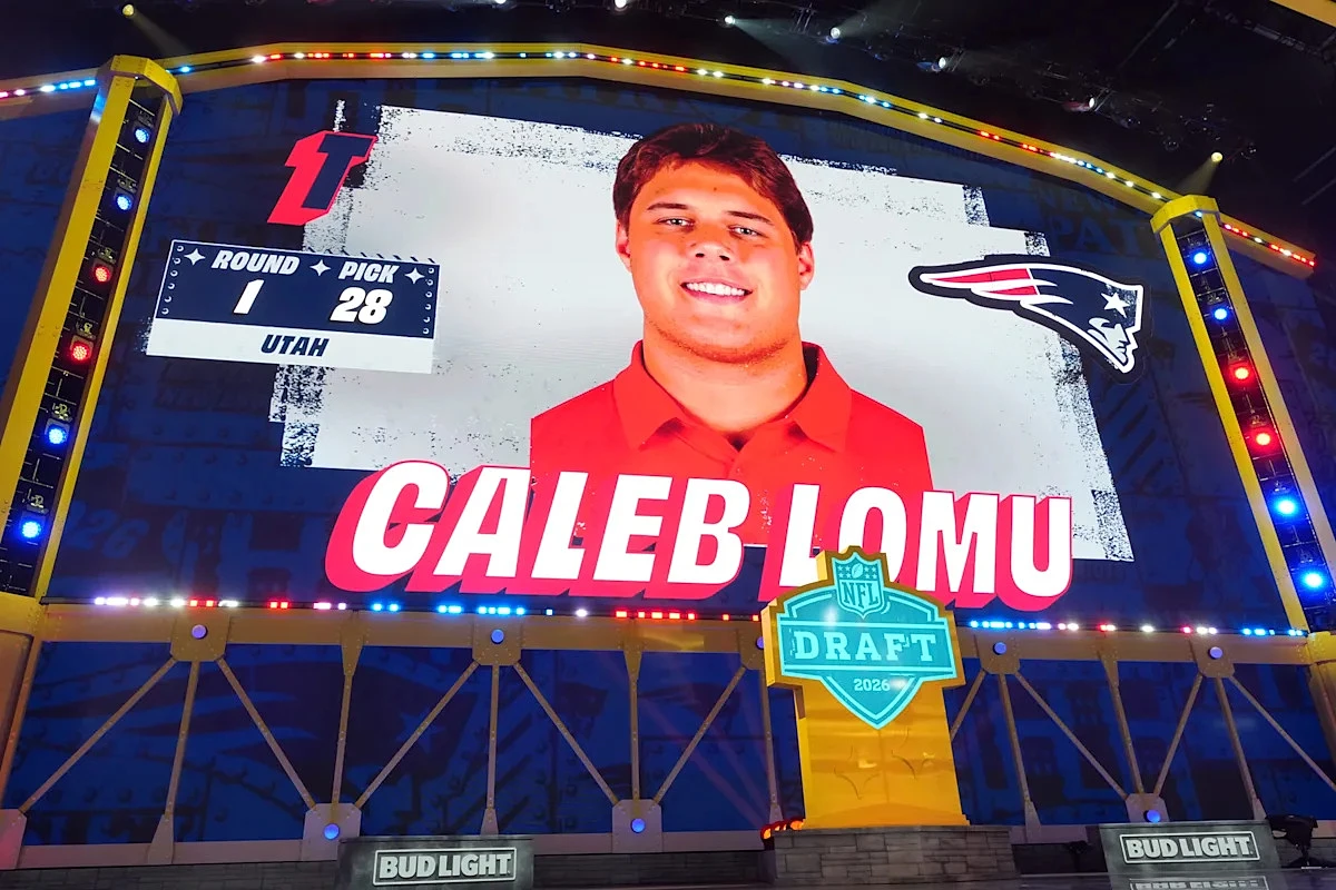 The Patriots fortified their offensive line by trading up to No. 28 and selecting Utah offensive tackle Caleb Lomu. According to ESPN's Adam Schefter, the Patriots traded picks No. 31 and No. 125 to the Buffalo Bills to move up the draft board.
