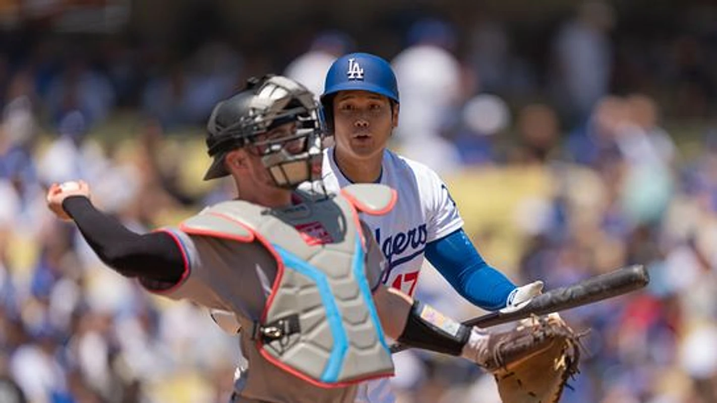 Los Angeles Dodgers pitcher Shohei Ohtani (17) ducking away from a ball during an MLB baseball game against the Miami Marlins on April 29th, 2026 in Los Angeles, CA.