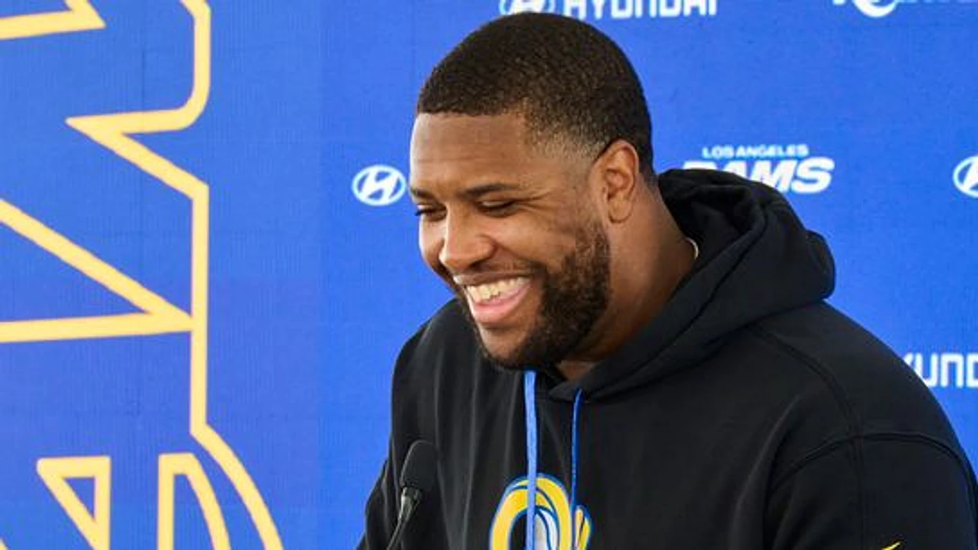 The Los Angeles Rams DT Kobie Turner #91 talks during a press conference, April 20th, 2026 in Woodland Hills California.