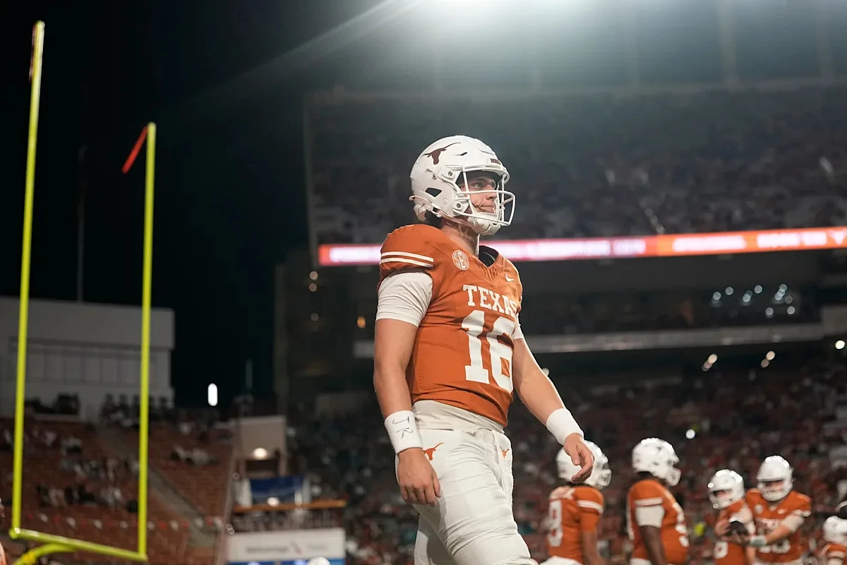 AUSTIN, TEXAS - APRIL 18: MJ Morris #19 of the Texas Longhorns throws the ball during the Texas Spring Football Game at Darrell K Royal-Texas Memorial Stadium on April 18, 2026 in Austin, Texas. (Photo by Scott Wachter/Getty Images for ONIT)AUSTIN, TEXAS - APRIL 18: KJ Lacey Jr. #9 of the Texas Longhorns looks to pass the ball during the Texas Spring Football Game at Darrell K Royal-Texas Memorial Stadium on April 18, 2026 in Austin, Texas. (Photo by Scott Wachter/Getty Images for ONIT)AUSTIN, TEXAS - APRIL 18: Dia Bell #6 of the Texas Longhorns looks on during the Texas Spring Football Game at Darrell K Royal-Texas Memorial Stadium on April 18, 2026 in Austin, Texas. (Photo by Scott Wachter/Getty Images for ONIT)AUSTIN, TEXAS - APRIL 18: Dia Bell #6 of the Texas Longhorns looks on during the Texas Spring Football Game at Darrell K Royal-Texas Memorial Stadium on April 18, 2026 in Austin, Texas. (Photo by Scott Wachter/Getty Images for ONIT)AUSTIN, TEXAS - APRIL 18: KJ Lacey Jr. #9 of the Texas Longhorns runs for yardage past Richard Wesley #99 during the Texas Spring Football Game at Darrell K Royal-Texas Memorial Stadium on April 18, 2026 in Austin, Texas. (Photo by Scott Wachter/Getty Images for ONIT)AUSTIN, TEXAS - APRIL 18: KJ Lacey Jr. #9 of the Texas Longhorns runs for yardage past Richard Wesley #99 during the Texas Spring Football Game at Darrell K Royal-Texas Memorial Stadium on April 18, 2026 in Austin, Texas. (Photo by Scott Wachter/Getty Images for ONIT)AUSTIN, TEXAS - APRIL 18: KJ Lacey Jr. #9 of the Texas Longhorns enters the field before the Texas Spring Football Game at Darrell K Royal-Texas Memorial Stadium on April 18, 2026 in Austin, Texas. (Photo by Scott Wachter/Getty Images for ONIT)AUSTIN, TEXAS - APRIL 18: KJ Lacey Jr. #9 of the Texas Longhorns looks to pass the ball during the Texas Spring Football Game at Darrell K Royal-Texas Memorial Stadium on April 18, 2026 in Austin, Texas. (Photo by Scott Wachter/Getty Images for ONIT)AUSTIN, TEXAS - APRIL 18: KJ Lacey Jr. #9 of the Texas Longhorns runs for yardage past Richard Wesley #99 during the Texas Spring Football Game at Darrell K Royal-Texas Memorial Stadium on April 18, 2026 in Austin, Texas. (Photo by Scott Wachter/Getty Images for ONIT)AUSTIN, TEXAS - APRIL 18: KJ Lacey Jr. #9 of the Texas Longhorns passes the ball during the Texas Spring Football Game at Darrell K Royal-Texas Memorial Stadium on April 18, 2026 in Austin, Texas. (Photo by Scott Wachter/Getty Images for ONIT)AUSTIN, TEXAS - APRIL 18: Raleek Brown #0 of the Texas Longhorns warms up before the Texas Spring Football Game at Darrell K Royal-Texas Memorial Stadium on April 18, 2026 in Austin, Texas. (Photo by Scott Wachter/Getty Images for ONIT)AUSTIN, TEXAS - APRIL 18: Cam Coleman #8 of the Texas Longhorns runs a route during the Texas Spring Football Game at Darrell K Royal-Texas Memorial Stadium on April 18, 2026 in Austin, Texas. (Photo by Scott Wachter/Getty Images for ONIT)AUSTIN, TEXAS - APRIL 18: Trevor Goosby #74 of the Texas Longhorns looks to make a block during the Texas Spring Football Game at Darrell K Royal-Texas Memorial Stadium on April 18, 2026 in Austin, Texas. (Photo by Scott Wachter/Getty Images for ONIT)AUSTIN, TEXAS - APRIL 18: Cam Coleman #8 of the Texas Longhorns catches a pass during the Texas Spring Football Game at Darrell K Royal-Texas Memorial Stadium on April 18, 2026 in Austin, Texas. (Photo by Scott Wachter/Getty Images for ONIT)AUSTIN, TEXAS - APRIL 18: Cam Coleman #8 of the Texas Longhorns during the Texas Spring Football Game at Darrell K Royal-Texas Memorial Stadium on April 18, 2026 in Austin, Texas. (Photo by Scott Wachter/Getty Images for ONIT)AUSTIN, TEXAS - APRIL 18: Raleek Brown #0 of the Texas Longhorns warms up before the Texas Spring Football Game at Darrell K Royal-Texas Memorial Stadium on April 18, 2026 in Austin, Texas. (Photo by Scott Wachter/Getty Images for ONIT)AUSTIN, TEXAS - APRIL 18: Raleek Brown #0 of the Texas Longhorns runs for yardage during the Texas Spring Football Game at Darrell K Royal-Texas Memorial Stadium on April 18, 2026 in Austin, Texas. (Photo by Scott Wachter/Getty Images for ONIT)AUSTIN, TEXAS - APRIL 18: Cam Coleman #8 of the Texas Longhorns runs a route during the Texas Spring Football Game at Darrell K Royal-Texas Memorial Stadium on April 18, 2026 in Austin, Texas. (Photo by Scott Wachter/Getty Images for ONIT)AUSTIN, TEXAS - APRIL 18: Running back Hollywood Smothers #2 of the Texas Longhorns during the Texas Spring Football Game at Darrell K Royal-Texas Memorial Stadium on April 18, 2026 in Austin, Texas. (Photo by Scott Wachter/Getty Images for ONIT)AUSTIN, TEXAS - APRIL 18: Sterling Berkhalter #18 of the Texas Longhorns runs for yardage after making a catch during the Texas Spring Football Game at Darrell K Royal-Texas Memorial Stadium on April 18, 2026 in Austin, Texas. (Photo by Scott Wachter/Getty Images for ONIT)AUSTIN, TEXAS - APRIL 18: Hero Kanu #93 of the Texas Longhorns rushes the quarterback during the Texas Spring Football Game at Darrell K Royal-Texas Memorial Stadium on April 18, 2026 in Austin, Texas. (Photo by Scott Wachter/Getty Images for ONIT)AUSTIN, TEXAS - APRIL 18: Ryan Wingo #1 of the Texas Longhorns runs a route during the Texas Spring Football Game at Darrell K Royal-Texas Memorial Stadium on April 18, 2026 in Austin, Texas. (Photo by Scott Wachter/Getty Images for ONIT)AUSTIN, TEXAS - APRIL 18: Running back Hollywood Smothers #2 of the Texas Longhorns runs for yardage during the Texas Spring Football Game at Darrell K Royal-Texas Memorial Stadium on April 18, 2026 in Austin, Texas. (Photo by Scott Wachter/Getty Images for ONIT)AUSTIN, TEXAS - APRIL 18: Jermaine Bishop Jr. #4 of the Texas Longhorns makes a catch ahead of Bo Mascoe #5 during the Texas Spring Football Game at Darrell K Royal-Texas Memorial Stadium on April 18, 2026 in Austin, Texas. (Photo by Scott Wachter/Getty Images for ONIT)AUSTIN, TEXAS - APRIL 18: Running back Hollywood Smoth